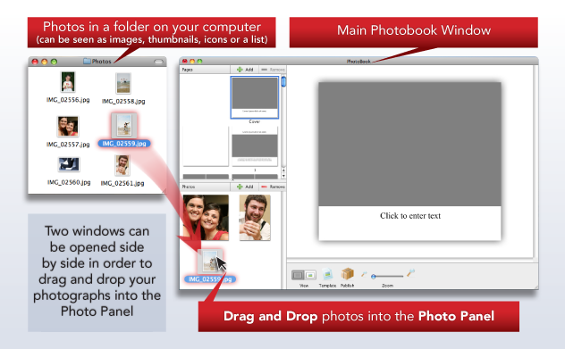 The example shown here is from Apple Mac but it works equally as well in Windows computers. The pictures are in a folder and are viewed as thumbnails. 10, 20 or even 100 photos can be selected at once and dragged onto the photo panel however if there are a large number it could take a while to process them. Photos can also be imported and removed using the + or – buttons on the top right of each panel.